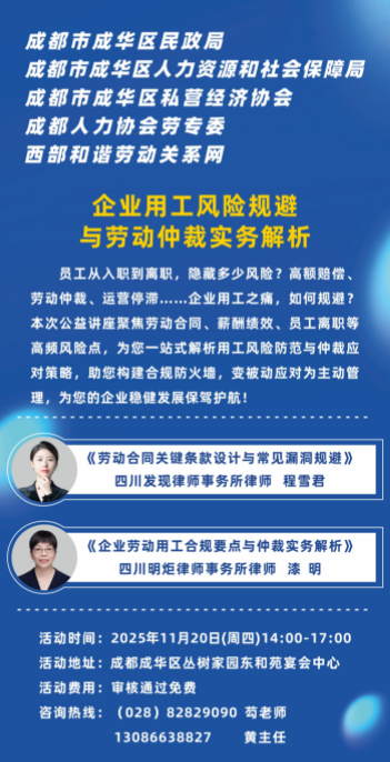 企业用工风险规避与劳动仲裁实务解析公益讲座将于11月在成都举办